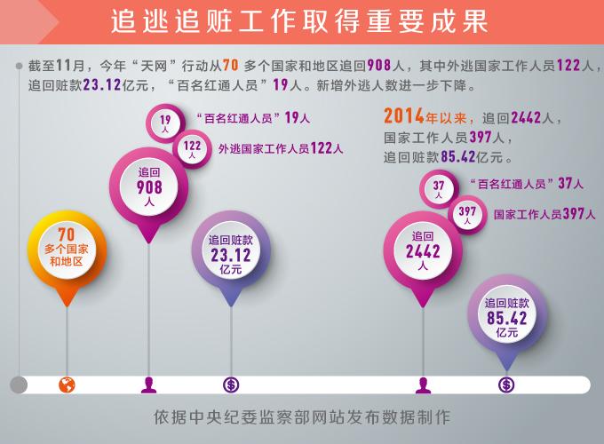 “截至11月,今年‘天網(wǎng)’行動(dòng)共從70多個(gè)國(guó)家和地區(qū)追回908人,其中外逃國(guó)家工作人員122人,追回贓款23.12億元,‘百名紅通人員’19人!12月9日,第13個(gè)“國(guó)際反腐敗日”到來(lái)之際,國(guó)家預(yù)防腐敗局副局長(zhǎng)、中央紀(jì)委國(guó)際合作局局長(zhǎng)劉建超接受采訪時(shí)表示,“中國(guó)正在以自身追逃追贓的實(shí)踐引領(lǐng)國(guó)際反腐敗執(zhí)法合作!