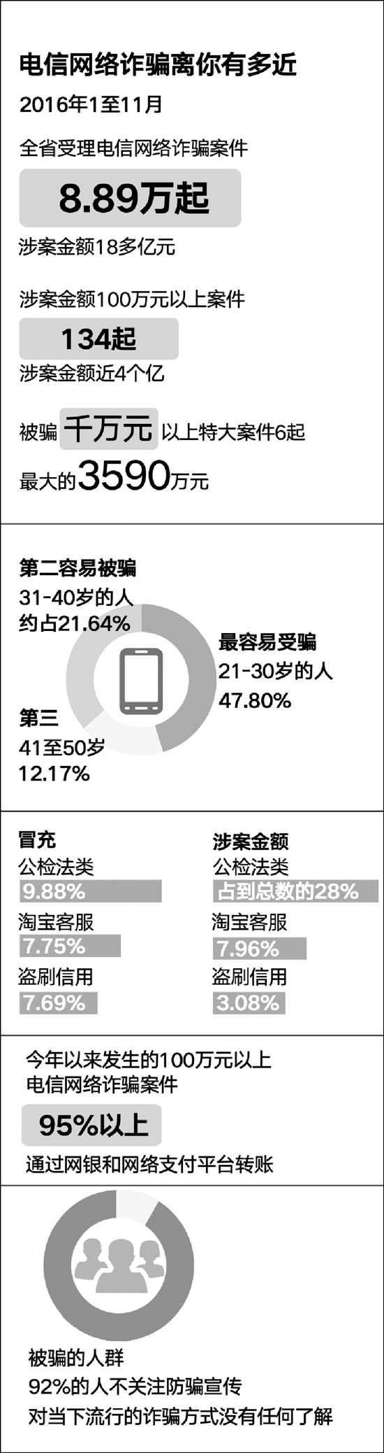 全省受理電信網(wǎng)絡(luò)詐騙案件8.89萬(wàn)起,涉案金額18多億元;涉案金額100萬(wàn)元以上案件134起,涉案金額近4個(gè)億;被騙千萬(wàn)元以上的特大案件有6起,最大的一起3590萬(wàn)元……這,只是今年1至11月的數(shù)據(jù)。