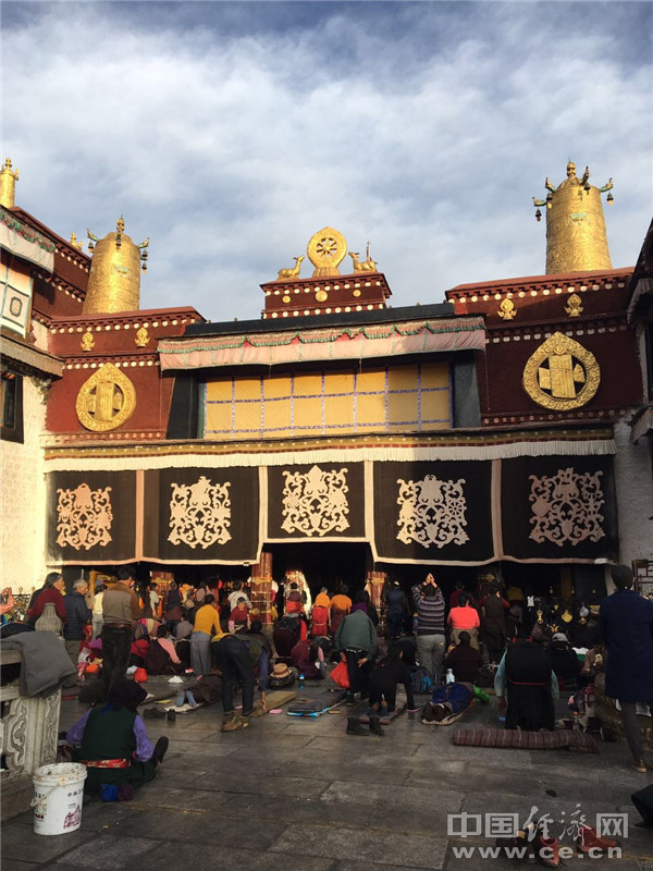 大昭寺前跪拜的信眾。 中國經(jīng)濟(jì)網(wǎng)記者李婧 攝。