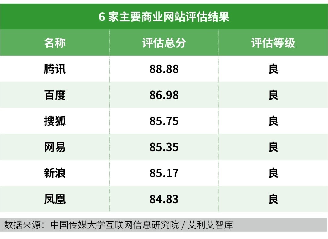 6家主要商業(yè)網(wǎng)站平均總分為86.16分,網(wǎng)站信息生態(tài)總體表現(xiàn)為良。騰訊、百度、搜狐憑借高響應(yīng)度以及內(nèi)容安全保障能力表現(xiàn)較好,優(yōu)于其他商業(yè)網(wǎng)站。評估總分情況如下: