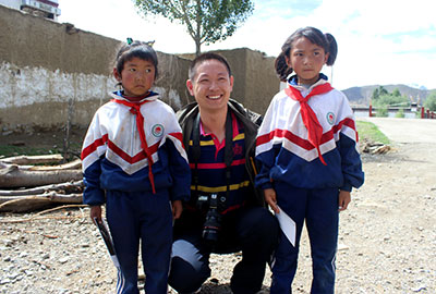去日喀則偏遠(yuǎn)農(nóng)村探訪(fǎng)時(shí),趙方印(中)給孩子發(fā)放完愛(ài)心款后,跟孩子們一起合影。