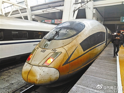 4日,有網(wǎng)友稱從徐州發(fā)往北京的高鐵,在到達(dá)目的地后車身變成了“金色”。該網(wǎng)友向北青報(bào)記者描述道,“像是霧霾,整個(gè)車身非常臟,但也不排除是因?yàn)樘鞖獠缓盟詼p少了列車清洗次數(shù)!