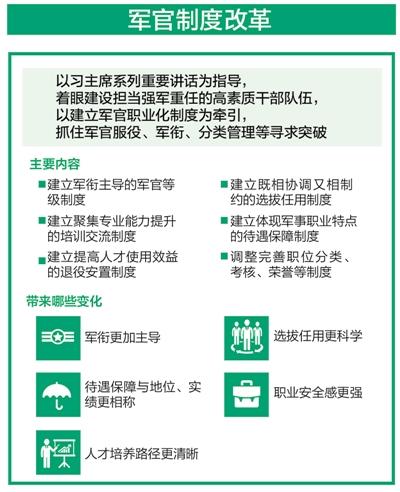 記者:這次軍官制度改革帶有基礎性、系統(tǒng)性,涉及軍官服役和管理的各方面各環(huán)節(jié),力度、深度、廣度前所未有。如何保障軍官制度改革在相關法律授權基礎上探索試行、穩(wěn)妥推進?