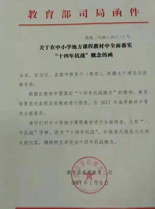 《函件》表示,根據(jù)在教材中要落實(shí)“十四年抗戰(zhàn)概念”的精神,教育部要求對(duì)各級(jí)各類(lèi)教材進(jìn)行修改,在2017年春季教材中全面落實(shí)。