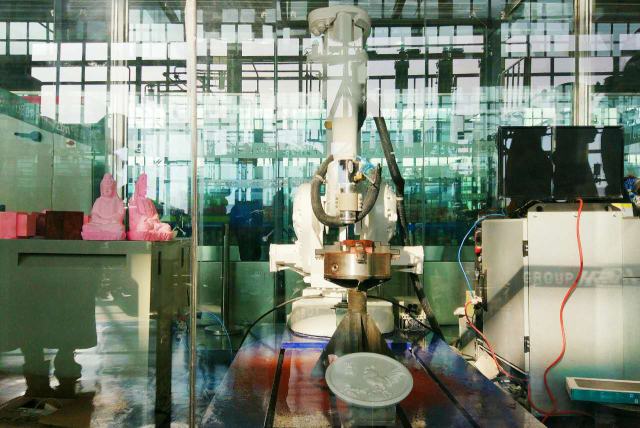 這是雕刻機器人,能夠?qū)浗饘倩蜍洸牧线M行高速鉆削和雕刻,還可以根據(jù)三維模型自動生成加工軌跡,比人工更加精準(zhǔn)。