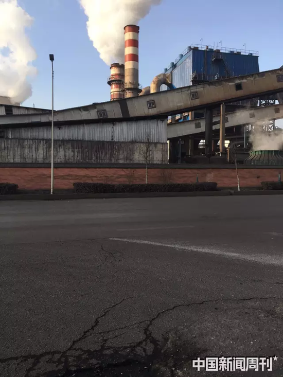 在7號(hào)廠區(qū)的紅色院墻內(nèi),一棟三層樓高的生產(chǎn)車間緊挨著馬路,像壘起的集裝箱,銀白色的墻皮已經(jīng)老舊,蒙上黑色的粉塵。機(jī)器轟鳴震耳,卻只能看到幾個(gè)黑洞洞的窗戶。車間樓下緊貼院墻處,四個(gè)巨大的罐體冒著白色的蒸汽,冷卻的水滴如同小雨,斜斜地拍到路人的臉上,即使在15米寬的馬路對(duì)面都無(wú)法避免。