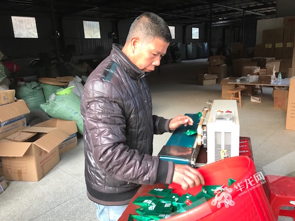 王明江在茶廠做包裝茶葉的工作,如今一家人順利脫貧。記者 ? 攝