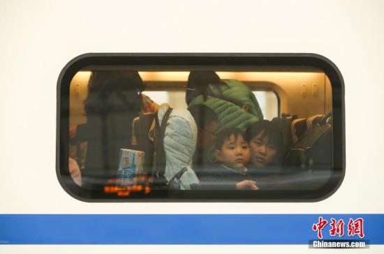 1月16日,武漢漢口火車站,一對母子望著窗外等待列車開動。中新社記者 張暢 攝