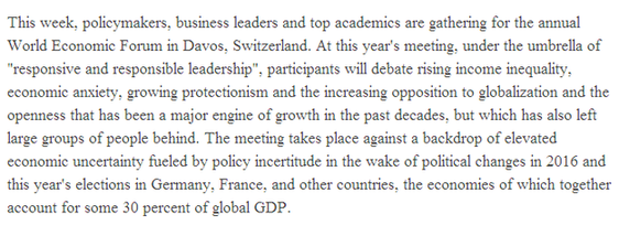 全球化與開(kāi)放在過(guò)去幾十年里是拉動(dòng)經(jīng)濟(jì)增長(zhǎng)的主要引擎,但也有大批民眾落伍。本屆論壇召開(kāi)的背景是2016年政壇變動(dòng)后政策不確定和今年德國(guó)、法國(guó)及其他國(guó)家即將迎來(lái)大選導(dǎo)致經(jīng)濟(jì)不確定性上升,這些國(guó)家的經(jīng)濟(jì)總量占全球GDP的30%左右。