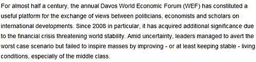 近半個(gè)世紀(jì)以來,一年一度的達(dá)沃斯世界經(jīng)濟(jì)論壇為各國政要、商界精英、專家學(xué)者們就全球發(fā)展議題提供了一個(gè)極為有用的交換意見的平臺(tái)。尤其是自2008年以來,隨著金融危機(jī)給世界穩(wěn)定帶來威脅,達(dá)沃斯論壇的重要性也隨之提升。在動(dòng)蕩不安中,各國領(lǐng)導(dǎo)人用盡手段,雖然避免了最壞的結(jié)果,但人民生活水平、特別是中產(chǎn)階級(jí),都或多或少地受到了危機(jī)的沖擊。