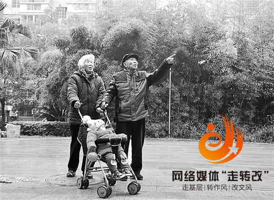 曹正富和老伴推著小孫女在小區(qū)里散步。