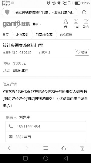 昨天,記者在58同城、閑魚等多家網(wǎng)絡(luò)平臺上看到有人出售春晚彩排門票。在趕集網(wǎng)上搜索“春晚彩排門票”,頁面上會跳出六七條相關(guān)帖子。其中一則“轉(zhuǎn)讓央視春晚彩排門票”的帖子,提示當(dāng)紅明星鹿晗、張藝興彩排等信息,標(biāo)注的價格為3500元。