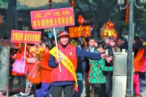 大年初一,海幢寺,志愿者舉牌提醒市民文明進(jìn)香。廣州日?qǐng)?bào)全媒體記者蘇俊杰攝