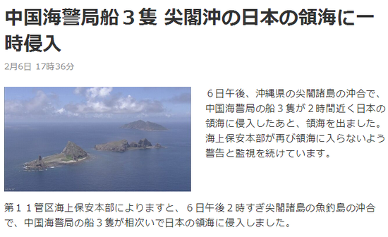 三艘中國海警船在釣魚島12海里內(nèi)巡航近兩個小時(NHK)