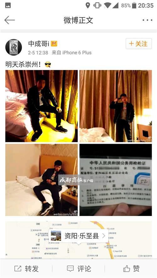 6日,該微博已被發(fā)布者“中成哥i”刪除。但根據(jù)報(bào)料者截圖,“明天殺崇州!”的微博發(fā)布于2月5日12時(shí)38分,微博發(fā)布時(shí)的定位為資陽市樂至縣公園路附近。4張配圖中,有3張同一小伙在賓館內(nèi)持槍的圖片,另有1張圖片為“中華人民共和國公務(wù)用槍槍證”,上面能清晰地看出證號(hào)、槍號(hào)、配備單位、槍型和發(fā)證機(jī)關(guān)!爸腥A人民共和國公務(wù)用槍槍證”顯示,槍支配備單位為資陽地區(qū)樂至縣公安局,槍型為六四式手槍,發(fā)證機(jī)關(guān)為四川省公安廳。