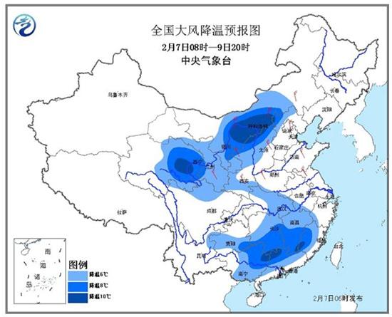 今天冷空氣將強勢發(fā)威,橫掃中東部,氣溫普降4~8℃。中央氣象臺預(yù)計,受冷空氣影響,7日至9日,我國中東部大部地區(qū)自北向南將出現(xiàn)大范圍大風(fēng)降溫,平均氣溫將普遍下降4℃以上,其中,青海東部、陜西北部、內(nèi)蒙古中部、山西北部、貴州東南部、湖南中南部、江西中南部、福建西部、廣西北部和廣東北部等地氣溫將下降8℃以上,局地超過10℃。長江以北地區(qū)并伴有4~6級偏北風(fēng),東部和南部海區(qū)風(fēng)力有7~9級。中央氣象臺2月7日06時繼續(xù)發(fā)布寒潮藍(lán)色預(yù)警。