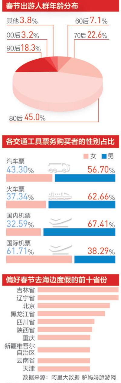 通過大數(shù)據(jù)觀察,春節(jié)游客的組成和出行人數(shù)正發(fā)生變化。在攜程上,80%以上預(yù)訂游客以家庭為單位。旅游專家分析,這說明家庭旅游的趨勢越來越明顯。在中國社會(huì)老齡化趨勢、二孩放開的背景下,家庭旅游市場會(huì)不斷擴(kuò)大。
