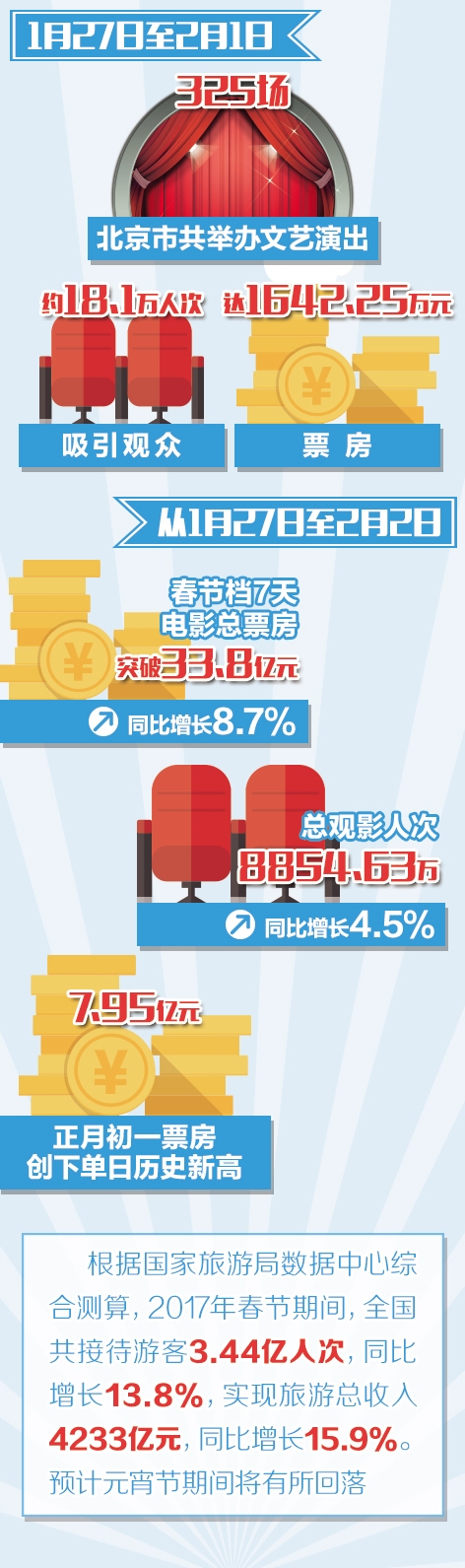 劇場(chǎng)演出成為新寵。1月27日至2月1日,北京市共舉辦文藝演出325場(chǎng),吸引觀眾約18.1萬(wàn)人次,票房達(dá)1642.25萬(wàn)元。親子家庭類群體成為第二大文藝演出消費(fèi)主體,占據(jù)春節(jié)期間北京演出觀眾總?cè)藬?shù)的17%,76場(chǎng)兒童劇演出共吸引3萬(wàn)人次。