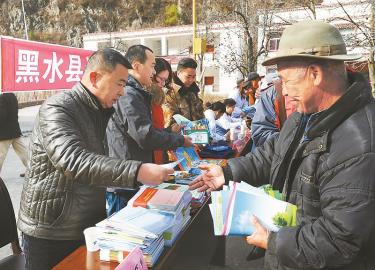 黑水縣工作人員為村民發(fā)放種養(yǎng)類科技讀物。圖片由 何才華 史雨 本報記者 徐中成 攝