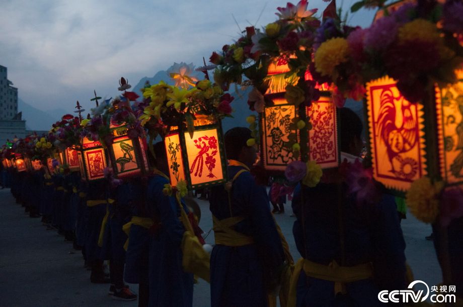 2月14日夜間,甘肅甘南藏族自治州舟曲縣境內(nèi),二百余名男性身著藍(lán)色盤口大褂,腰間纏或紅、或綠、或黃的各色絲質(zhì)腰帶,將寫有菩薩名字的旗號(hào)迎到燈會(huì)聚點(diǎn)。 (央視網(wǎng)記者 王小英 報(bào)道 衛(wèi)斌/攝)