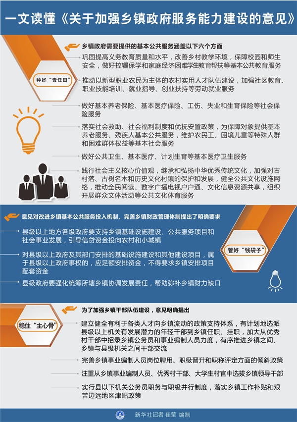 新形勢下,鄉(xiāng)鎮(zhèn)政府的基本公共服務(wù)職責(zé)有哪些?如何管好鄉(xiāng)鎮(zhèn)政府的“錢袋子”?如何為基層干部“強(qiáng)筋健骨”,穩(wěn)住鄉(xiāng)鎮(zhèn)的“主心骨”?中共中央辦公廳、國務(wù)院辦公廳近日印發(fā)《關(guān)于加強(qiáng)鄉(xiāng)鎮(zhèn)政府服務(wù)能力建設(shè)的意見》,對(duì)加快鄉(xiāng)鎮(zhèn)政府職能轉(zhuǎn)變等提出了新目標(biāo)、新任務(wù)、新要求。