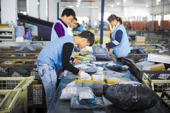 工作人員分配電子商務快遞包裹。(圖片來自網(wǎng)絡)