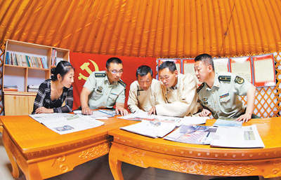 圖為邊防民警和牧民在“黨員中心戶”學(xué)習(xí)黨的惠牧政策。資料照片