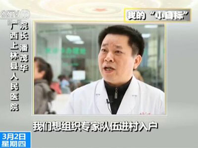 廣西壯族自治區(qū)上林縣人民醫(yī)院院長(zhǎng)潘茂華:我們想組織專(zhuān)家隊(duì)伍進(jìn)村入戶(hù),對(duì)這些因病返貧、因病致貧的人群進(jìn)行摸底排查,精準(zhǔn)識(shí)別,制定一些診療的方案,實(shí)現(xiàn)他們脫貧。