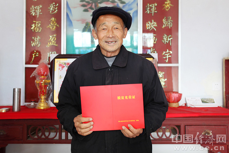 2016年12月19日,安徽省六安市,霍山縣但家廟鎮(zhèn)觀音巖村的貧困戶廣存祥老人拿到脫貧光榮證。圖片來源:CFP