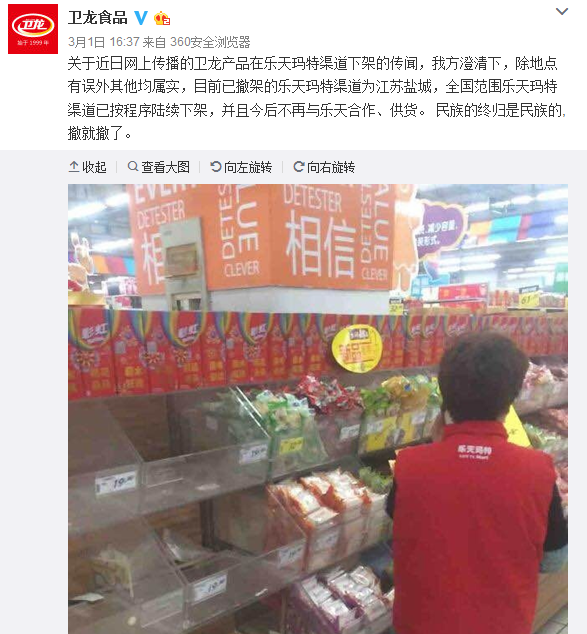 有網(wǎng)友爆料:武漢樂天瑪特內(nèi)衛(wèi)龍辣條全部撤柜,“一根辣條都不給樂天留”。@衛(wèi)龍食品 1日稱,傳聞除地點(diǎn)有誤外其他均屬實(shí),目前已撤架的樂天瑪特為江蘇鹽城,不過全國范圍樂天瑪特渠道已按程序陸續(xù)下架,今后將不再與樂天合作。
