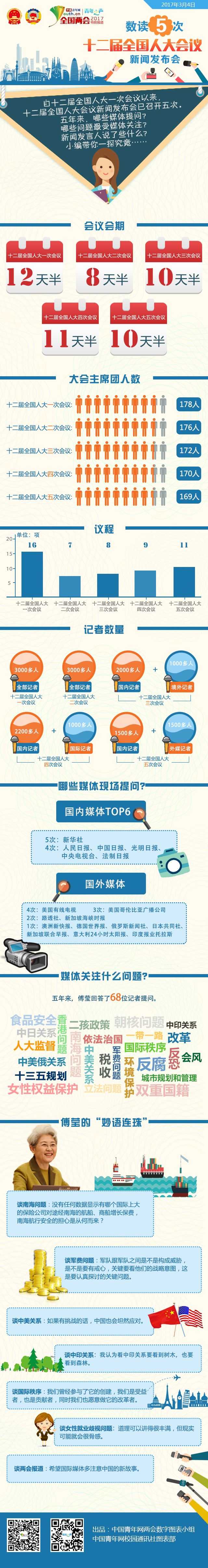 中國青年網(wǎng)北京3月4日電自十二屆全國人大一次會議以來,十二屆全國人大會議新聞發(fā)布會已召開五次。五年來,哪些媒體提問?哪些問題最受媒體關注?新聞發(fā)言人說了些什么?小編帶你一探究竟……