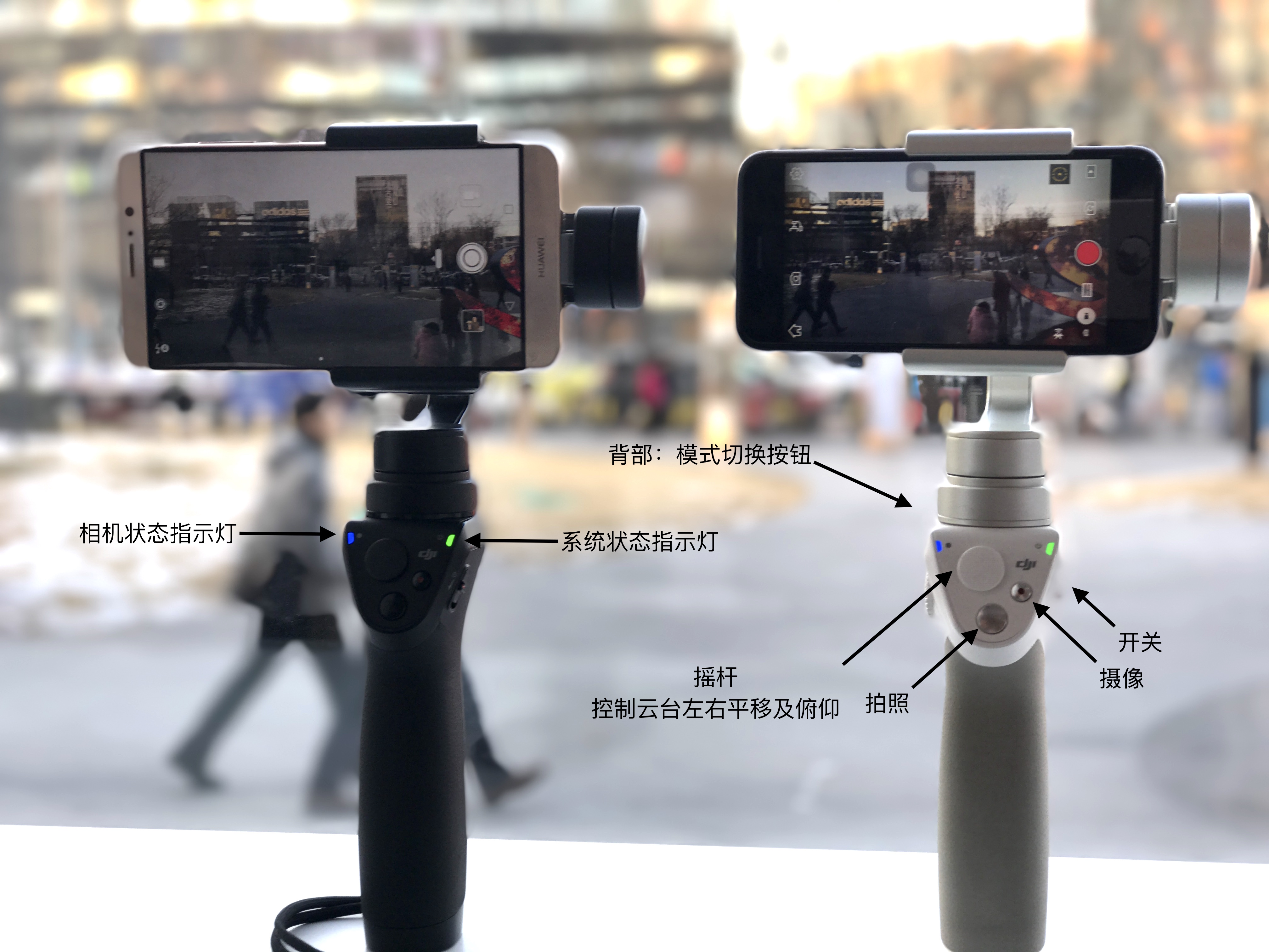 上圖是Osmo,它自帶相機(jī),在三軸云臺的作用下可以拍出穩(wěn)定的視頻及照片,手機(jī)是用來連接“DJI GO”app并接收圖傳畫面。Osmo Mobile沒有鏡頭,它是一個輔助設(shè)備,簡單說可以幫助手機(jī)拍出更為穩(wěn)定的視頻及照片,而這些視頻及照片的質(zhì)量完全依靠加載的手機(jī)。