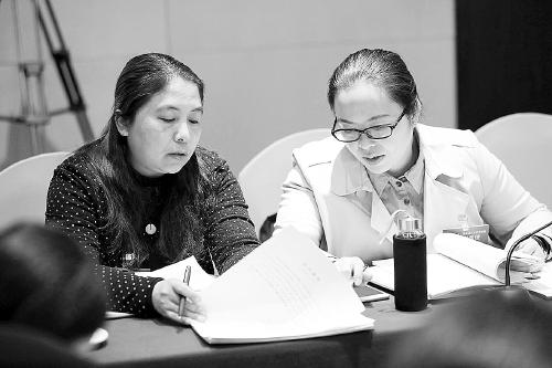 資艷萍代表(左)與鄧瑞代表查看會(huì)議資料。本報(bào)記者張哲/攝
