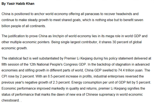 兩會不僅折射了中國的政策方向,還把中國的成功經驗帶給世界。對于存在失業(yè)、貧困和其他社會問題的國家來說,中國是它們可以參考和學習的樣本。包括巴基斯坦在內的一些發(fā)展中國家也面臨和中國一樣的貧困問題,而中國在脫貧扶貧方面的經驗值得這些國家學習。據(jù)悉,巴基斯坦政府決策層一直在研究中國2020年實現(xiàn)全面脫貧的偉大計劃,他們希望借鑒中國的扶貧經驗,甚至直接尋求中國的幫助。