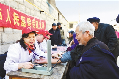 河北邢臺市人民醫(yī)院的醫(yī)務(wù)志愿者組成愛心醫(yī)療小分隊,為太行山區(qū)的留守、孤寡老人義診。圖為3月19日,醫(yī)生正在為村里老人測量血壓。記者 史自強攝