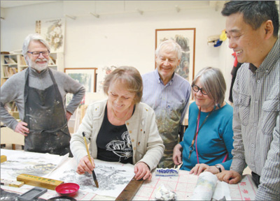 埃斯波藝術(shù)家協(xié)會(huì)主席、版畫家萊蒂寧通過學(xué)習(xí)中國(guó)畫,把中國(guó)文化的元素融進(jìn)了自己的版畫作品。圖為萊蒂寧(左二)在中國(guó)畫指導(dǎo)老師的畫室作畫。