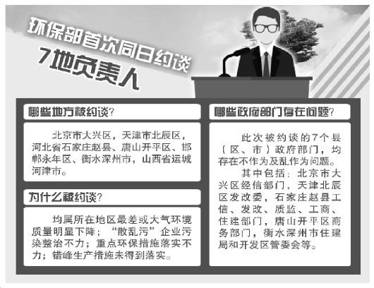 4月1日,北京市大興區(qū),天津市北辰區(qū),河北省石家莊趙縣、唐山開平區(qū)、邯鄲永年區(qū)、衡水深州市以及山西省運(yùn)城河津市政府主要負(fù)責(zé)人被環(huán)保部集中約談。環(huán)保部約談這7地的根本原因是大氣環(huán)境質(zhì)量惡化。