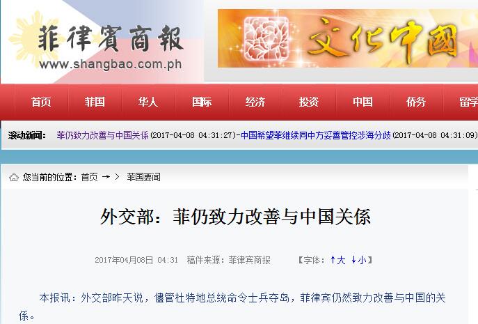 [環(huán)球網(wǎng)報道 記者 張驁]《菲律賓商報》4月8日報道稱,菲外交部7日表示,盡管總統(tǒng)杜特爾特“命令士兵奪島”,菲律賓仍然致力改善與中國的關系。