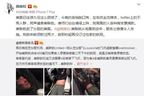 海外網(wǎng)4月11日電 美國聯(lián)合航空因超額訂票而將一名不愿意下機(jī)的華裔乘客強行拖走,致該名乘客流血受傷。4月11日,高曉松,劉強東,黃西等現(xiàn)身說法,表示之前做過美聯(lián)航的航班,因為服務(wù)傲慢、態(tài)度差,之后就沒再坐過!