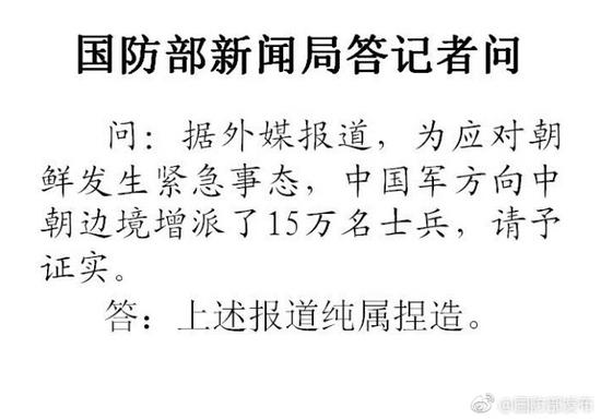 問:據(jù)外媒報道,為應(yīng)對朝鮮發(fā)生緊急事態(tài),中國軍方向中朝邊境增派了15萬名士兵,請予證實。