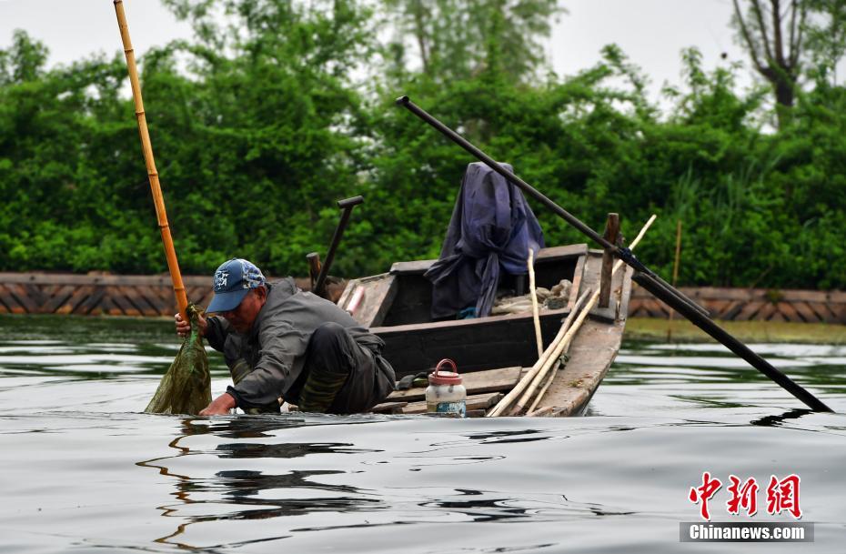 4月16日,雄安新區(qū)白洋淀,一位捕魚人正在忙碌。中新社記者 翟羽佳 攝