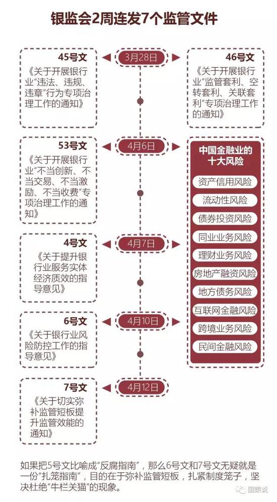 除了罰錢,違規(guī)行徑更要嚴(yán)加處理。金融反腐的核心之一,就是要強(qiáng)調(diào)補(bǔ)足漏洞、防止尋租。10天內(nèi),銀監(jiān)會連續(xù)出臺7份監(jiān)管文件,而縱觀這些文件,都突出了銀監(jiān)會引導(dǎo)資金脫虛入實、防控金融風(fēng)險的意圖。
