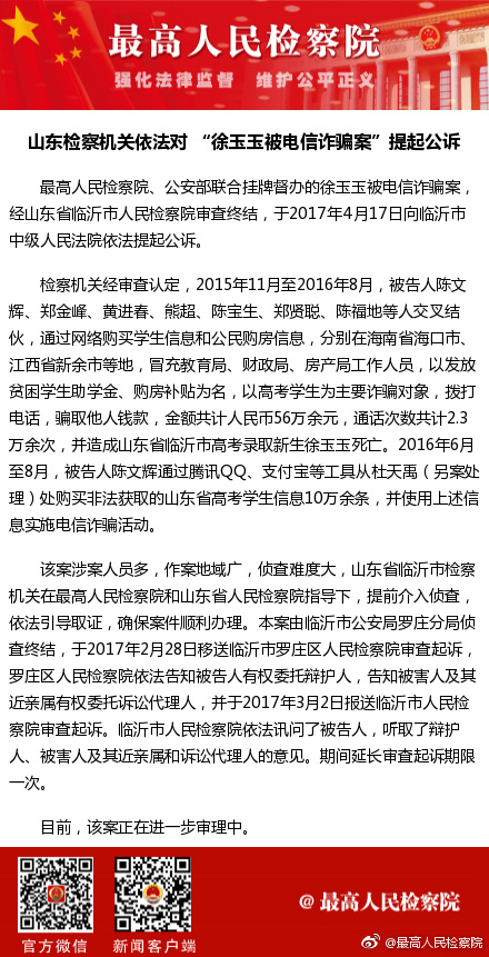 最高人民檢察院微信公號(hào)4月17日消息,最高人民檢察院、公安部聯(lián)合掛牌督辦的徐玉玉被電信詐騙案,經(jīng)山東省臨沂市人民檢察院審查終結(jié),于2017年4月17日向臨沂市中級(jí)人民法院依法提起公訴。