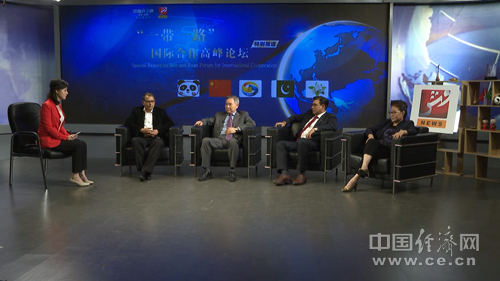 《“一帶一路”國際合作高峰論壇特別報道》錄制現(xiàn)場。從左至右分別為中國經(jīng)濟網(wǎng)主持人王曉彤、北京大學南亞學系巴基斯坦研究中心古拉姆·阿里博士、中國國際經(jīng)濟交流中心副總經(jīng)濟師徐洪才、巴基斯坦國民銀行北京代表處首席代表喬杜里·穆哈馬德·瓦希夫·阿斯拉姆、中國外匯投資研究院院長譚雅玲。中國經(jīng)濟網(wǎng)記者 張相成/攝