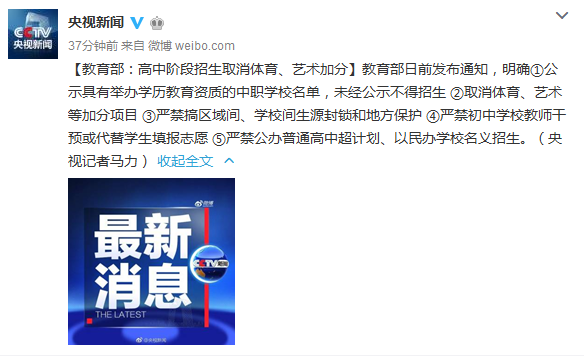 【教育部:高中階段招生取消體育、藝術(shù)加分】教育部日前發(fā)布通知,明確①公示具有舉辦學(xué)歷教育資質(zhì)的中職學(xué)校名單,未經(jīng)公示不得招生 ②取消體育、藝術(shù)等加分項目 ③嚴(yán)禁搞區(qū)域間、學(xué)校間生源封鎖和地方保護(hù) ④嚴(yán)禁初中學(xué)校教師干預(yù)或代替學(xué)生填報志愿 ⑤嚴(yán)禁公辦普通高中超計劃、以民辦學(xué)校名義招生。