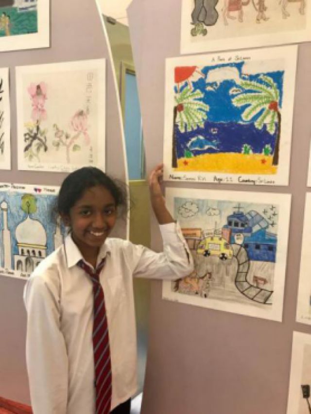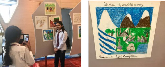 “這幅是我畫(huà)的,作品名字叫《我那美麗的祖國(guó)》!痹谝徽嬲故靖鲊(guó)兒童美術(shù)作品的墻前,11歲巴基斯坦女孩Mahrukh Asif指著其中一幅畫(huà)告訴記者。