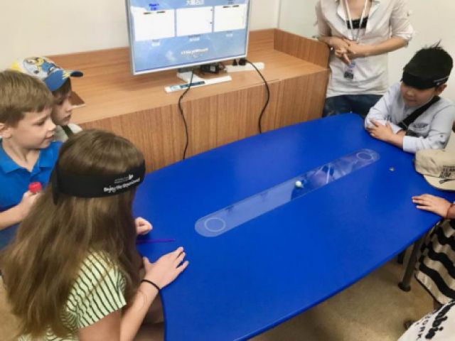 中外少年兒童在體驗(yàn)科創(chuàng)游戲“意念對(duì)決”,電腦將根據(jù)小朋友頭上佩戴的繩帶監(jiān)測(cè)他們對(duì)眼前這個(gè)小球的專(zhuān)注度,專(zhuān)注度高的一方將贏得比賽。