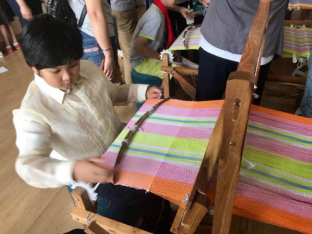 一名外國(guó)兒童在體驗(yàn)土布紡織