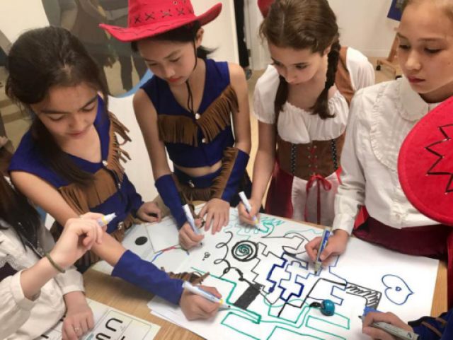 各國(guó)少年兒童在繪制一個(gè)讓小小機(jī)器人行走的迷宮