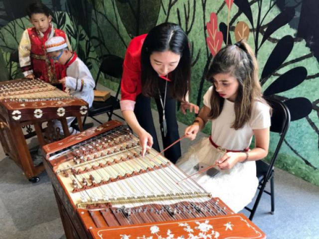 來(lái)自京西國(guó)際學(xué)校的意大利12歲女孩Rebecca Floris在現(xiàn)場(chǎng)工作人員指導(dǎo)下嘗試演奏揚(yáng)琴